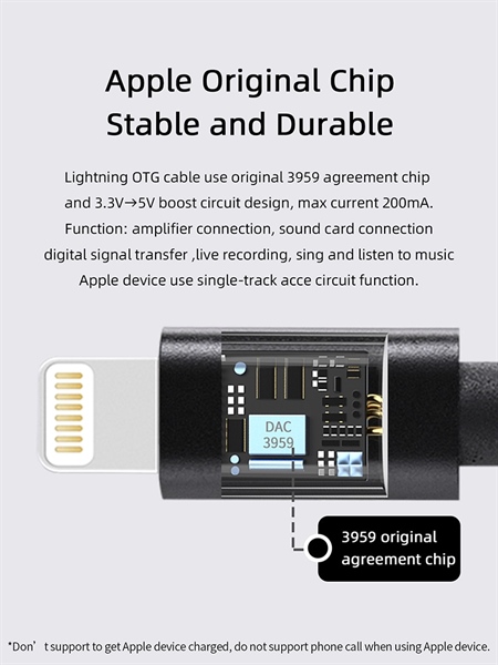 Cáp Lightning OTG sử dụng chip 3959 của Táo chính hãng và thiết kế mạch tăng áp 3.3v 5v DÒNG ĐIỆN TỐI ĐA 200Ma ( không hỗ trợ sạc cho đồ của Táo và không hỗ trợ cuộc gọi khi dùng các thiết bị nhà Táo )
