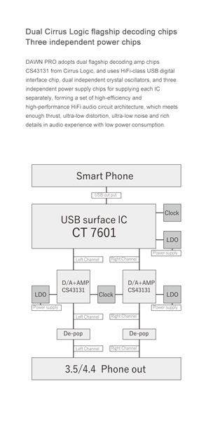 – Moondrop Dawn Pro sở hữu chip Dac CS43131 kép từ Cirrus Logics, hỗ trợ giải mã PCM 32bit/384kHz và DSD256 Native