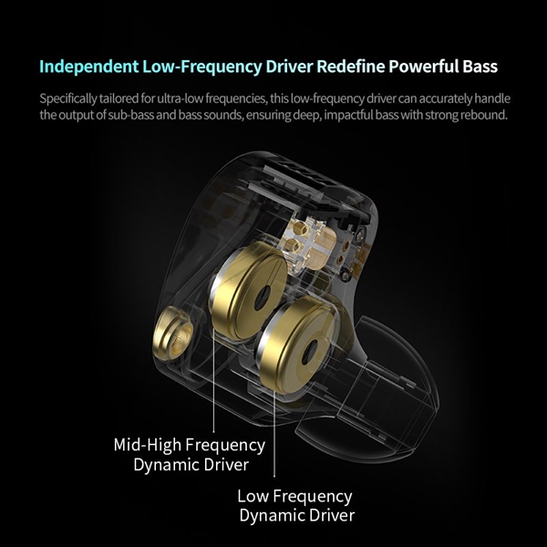 – Được trang bị 2 Driver Dynamic lõi kép lớn. 1 Driver mạch từ kép 10mm(xử lý các tần số thấp trong phạm vi 20-200Hz) + 1 Driver 10mm(đảm nhiệm tần số trung và cao) – những cải tiến mới giúp tăng độ nhạy và mở rộng tần số cao, âm trầm rõ nét, mang đến bước đột phá về chất lượng âm thanh, cho âm thanh đầy đặn hơn