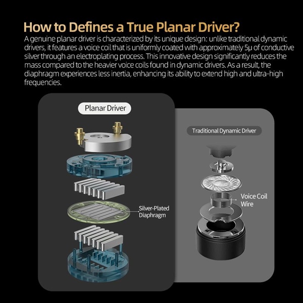 *Planar Driver: 1 trình điều khiển Planar thực sự được thiết kế với ít nhất 14 nam châm hiệu suất cao, có cuộn Voice coils được mạ điện đồng đều và được phủ khoảng 5μ bạc dẫn điện. Sự đổi mới này làm giảm đáng kể khối lượng và quán tính, cho phép màng loa mở rộng tần số cao và cực cao, âm trường rộng với độ chính xác cao hơn*