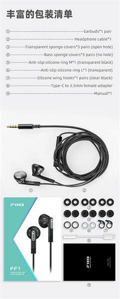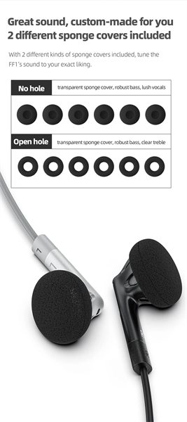 – Đi kèm cho FF1 có 3 cặp foam (sponge covers) lỗ mở 3 cặp foam (sponge covers) không có lỗ. Mỗi loại sẽ cho một kiểu âm khác nhau:
