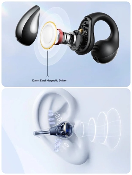 – Sở hữu thiết kế dạng Open-ear Clip-on (kiểu dáng kẹp tai độc đáo), trọng lượng nhẹ chỉ 5.85g mỗi bên, không chèn vào ống tai mang lại cảm giác đeo thoải mái, phù hợp cho cả người đeo kính
