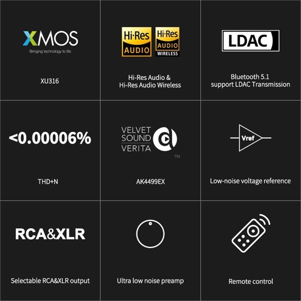 – Sở hữu XMOS XU316 thế hệ mới – giải mã USB mạnh mẽ, hỗ trợ PCM lên tới 32bit/768kHz, DSD512 Native, DSD256 DoP