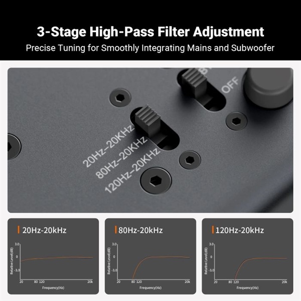 – Bộ lọc HPF ba cấp — Cho phép lọc tần số thấp ở ngõ ra RCA/XLR, chỉ đưa dải mid và treble ra loa chính trong khi bass được chuyển qua SUB-OUT – giúp cải thiện độ chi tiết, cân bằng tổng thể và âm hình