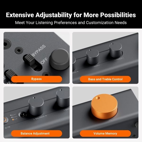 – Hỗ trợ tùy chỉnh bass/treble (±6dB treble, ±12dB bass), cân bằng L/R, kèm chức năng bypass. Bộ nhớ âm lượng tự động lưu lại cấu hình riêng cho từng nguồn phát