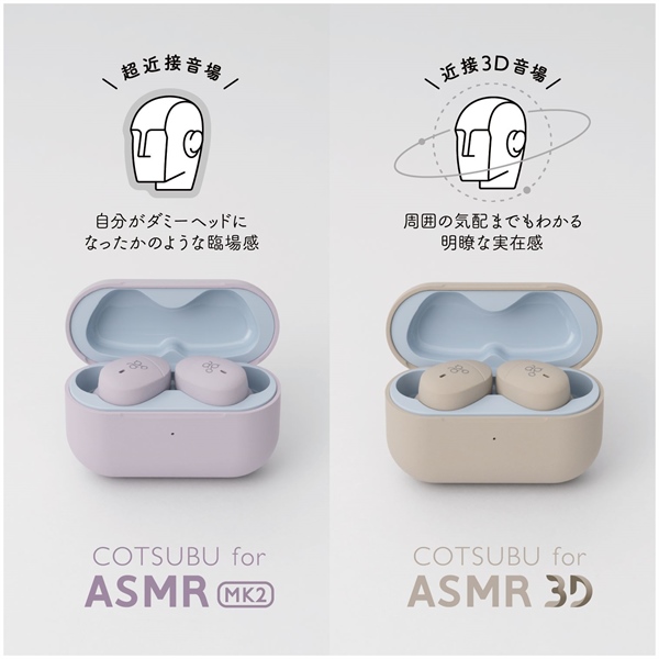 – COTSUBU for ASMR MK2 là tai nghe không dây đầu tiên trên thế giới dành cho ASMR. Sản phẩm áp dụng thiết kế chất lượng âm thanh chuyên biệt cho “Trường âm thanh cực gần” (Ultra-close Sound Field) giúp định vị hình ảnh âm thanh gần tai cho cảm giác chân thực như thể đang ở bên trong một micrô dummy head microphone