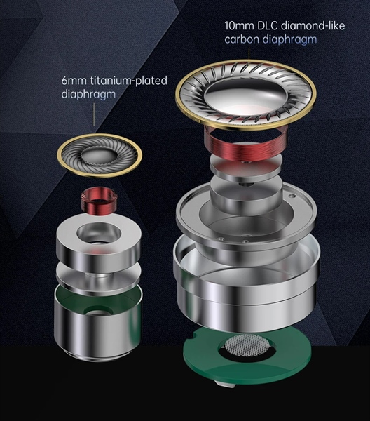 – Được trang bị Cấu Hình Dynamic kép với màng loa DLC (cacbon giống như kim cương) 10 mm mang lại độ cứng và độ cứng đặc biệt ,kết hợp với thiết kế buồng kép, Driver còn lại có màng ngăn mạ titan 6 mm, nổi tiếng với độ cứng, đặc tính nhẹ và khả năng tái tạo âm thanh có độ trung thực cao, giúp nâng cao hơn nữa trải nghiệm âm thanh.